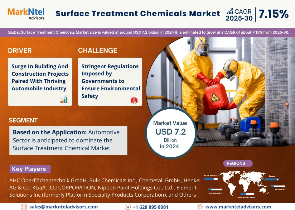 As per MarkNtel Advisors the Surface Treatment Chemicals Market size is valued at around USD 7.2 billion in 2024 and is estimated to grow at a CAGR of about 7.15% during the forecast period, i.e., 2025-30.