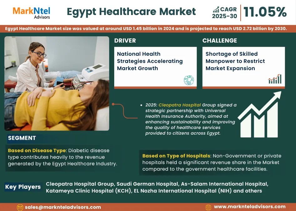 MarkNtel Advisors, a leading market research and consulting firm, has announced the release of its latest study titled Egypt Healthcare Market Research Report: Forecast (2025–2030). This report provides a detailed assessment of the Egypt Healthcare Market, covering its evolving dynamics, emerging trends, key growth drivers, major challenges, and competitive landscape.