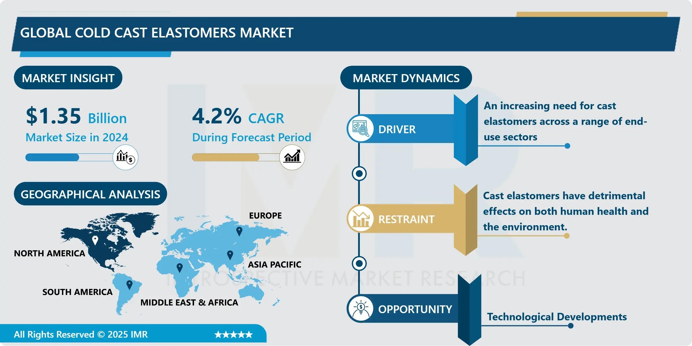 ntrospective Market Research, a global authority in market intelligence, today released a comprehensive report on the Cold Cast Elastomers Market. The research highlights the market’s steady and vital expansion, propelled by the surging global requirement for high-performance, lightweight, and durable materials, particularly within the automotive, aviation, and oil & gas sectors.