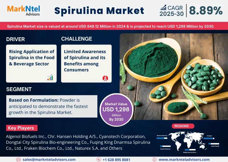 MarkNtel Advisors, a leading market research and consulting firm, has announced the release of its latest study titled Spirulina Market Research Report: Forecast (2025–2030). This report provides a detailed assessment of the Spirulina Market, covering its evolving dynamics, emerging trends, key growth drivers, major challenges, and competitive landscape.